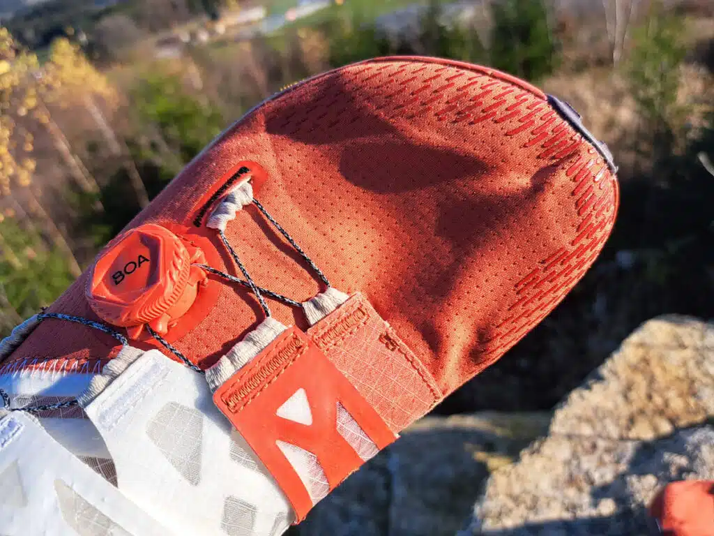 Wie oben beschrieben ist der Schuh sockenähnlich konstruiert. Das BOA Fit System ist dank zweier Drehräder perfekt. So hat auch ein schmaler Fuß im sonst eher breit konzipierten Schuh genügend Halt. Was aus unserer Sicht verbesserungswürdig ist, ist der Fersenhalt. Laut Online Berichten wurde dieser zwar im Gegensatz zum Vorgängermodell bereits verbessert, es bleibt aber dennoch genug Spielraum für Verbesserungen.