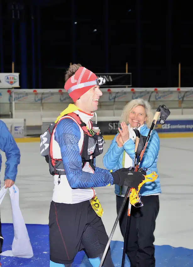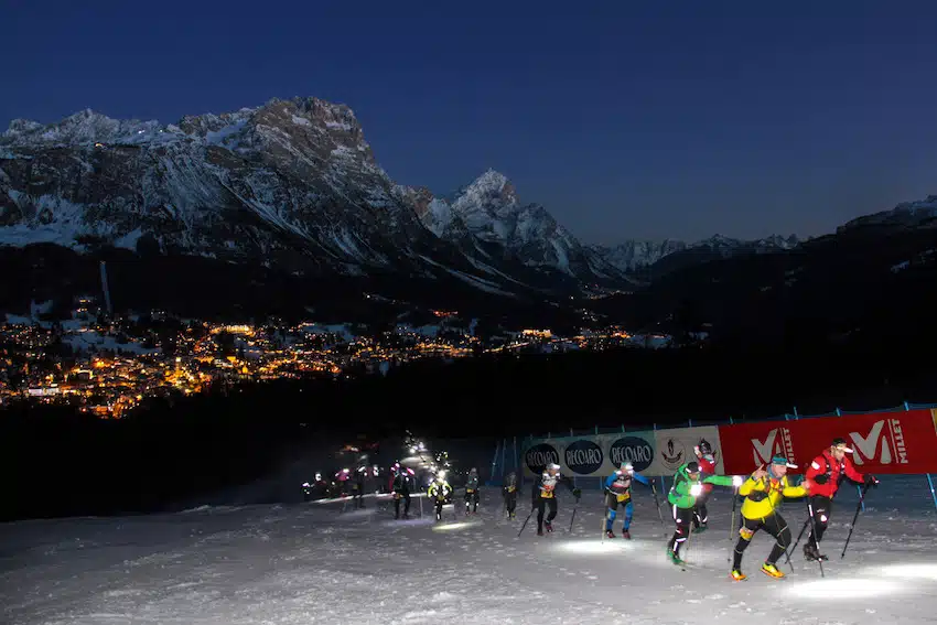 Der Start erfolgt direkt an der Flaniermeile von Cortina, die ersten paar Hundert Meter entlang von Prada, Gucci & Co, angefeuert von vielen teuer gekleideten und stylisch bebrillten Passanten, die doch recht begeisterungsfähig sind. Apropos Start: da kommt man aus dem Staunen nicht raus wer da so alles neben einem steht: vom Tour de France Sieger, mehreren Weltmeistern aus verschiedenen Ausdauersportarten, bis hin zum Tor des Giantes Bestzeit – Super- Helden ist das Startfeld nicht nur prominent besetzt, sonder auch bärenstark! Und so entwickelten sich die ersten 1,5k – übrigens die einzigen ohne Schnee – auch gleich zum Sprint um die beste Ausgangsplatzierung für den geplanten Boxenstopp: „cramps- on“ – also Eisen rauf. Wohl gemerkt: eh nur noch 15,5k mit 1200+ bis zum Ziel! Und in dieser Gangart geht es dann gleich weiter. Die ersten 3 Kilometer in richtiger Berglaufmanier. Immer wieder Wechsel von kurzen Anstiegen gefolgt von etwas flacheren, doch gut laufbaren Passagen. Noch ist das Feld recht gut sortiert, doch dann steht plötzlich die erste Wand vor dir: schwarze Piste! bedeutet Steigung von zumindest 20% und meistens eisig. Gott sei Dank ist es endlich finster, sodass die Einschätzung der wahren Steilheit des Anstiegs eh etwas trügt. Unerbitterlich „geht“ es nun an hacken. An Laufen ist nicht mehr zu denken! Die „cramps“ halten gerade noch so, doch ohne Stöcke wird es trotzdem ein Kampf gegen das „rückwärts“ abkugeln. Nach knapp 10min Aufstieg in diesem Schwierigkeitsgrad ist es auch mit dem engen Feld vorbei.