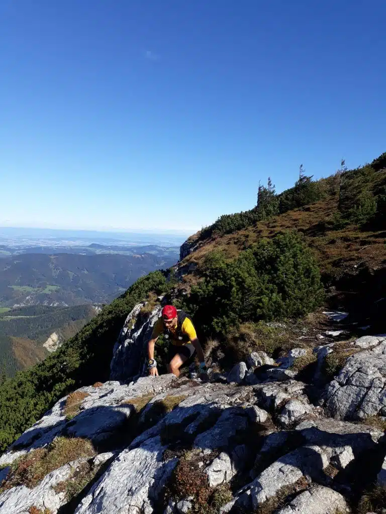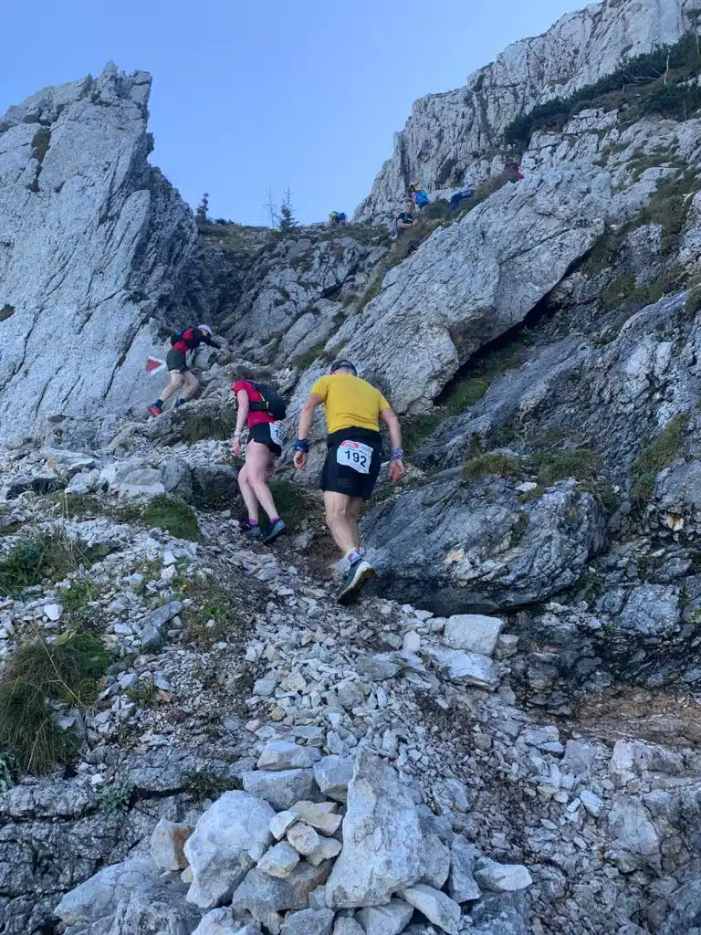 Nach dem relativ steilen Anstieg im Wald ging es nach der Baumgrenze auf den Rauhen Kamm – ein spektakulärer Abschnitt bis zum Gipfel. Die Aussicht war fantastisch und das Gelände genau nach meinem Geschmack. Immer wieder gab es kleine Passagen zum “Kraxeln”, sogar Seilversicherungen waren angebracht. Für ausreichend Sicherheit auf dieser anspruchsvollen Passage sorgten zahlreiche Bergretter, die den LäuferInnen gut zusprachen. Auch kleine Tipps wurden gegeben, wenn jemand ratsuchend vor einem Felsen stand und nicht wusste, wie es weiterging.
