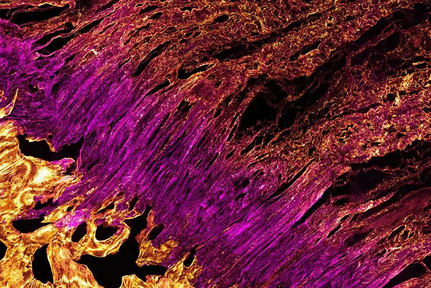 Ein Stück Schweineknochen mit Sehne, in der Orthopädie sorgfältig präpariert, wurde am Lehrstuhl für Zellbiophysik in eine Apparatur eingespannt und fixiert. Dann richteten die Forscherinnen und Forscher das Mikroskop auf die Grenzschicht, entlang derer die Sehne mit dem Knochen verwachsen ist. Mit Hilfe der Multiskalen-Mikroskopie-Technik wurden Dutzende von Aufnahmen erstellt und digital zu einem großen Bild zusammengeführt. – Auf diese Weise konnten wir die Struktur der feinen, aufgespleißten Fasern sichtbar machena – , berichtet Bausch.