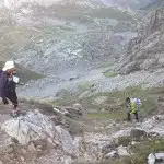 Danach beginnt der verrückteste Anstieg meines Lebens. Man stelle sich Steinplatten und Geröll vor, ohne Weg, bis zu 40 Grad steil. Es ist in der Tat noch viel verrückter als es klingt, es ist – in meinen Augen – völlig sinnlos. Abenteuer ist das eine, die Gesundheit der Teilnehmer willkürlich aufs Spiel zu setzen das andere. Heli vergleicht es mit einem Himmelfahrtskommando und er hat völlig Recht. wäre es nicht mitten in der Nacht und hätten wir vorher gesehen, was für ein ‚Berg‘ da kommt, wir wären nicht hinaufgegangen. Hinunter geht es aber jetzt schon gar nicht mehr und so konzentrieren wir uns auf jeden einzelnen Schritt. Auf keinen Fall gehen wir zu eng zusammen, die Gefahr, dass irgendwelche Platten ins Rutschen und Rollen kommen und den anderen erschlagen, ist viel zu groß. Bei Regen will ich mir diese Passage gar nicht vorstellen, bei einem Gewitter wäre man hier überhaupt völlig schutzlos ausgesetzt. Zu viel darf ich gar nicht nachdenken, einen Schritt nach dem anderen setzen und darauf hoffen, dass dieser Wahnsinn bald ein Ende hat.