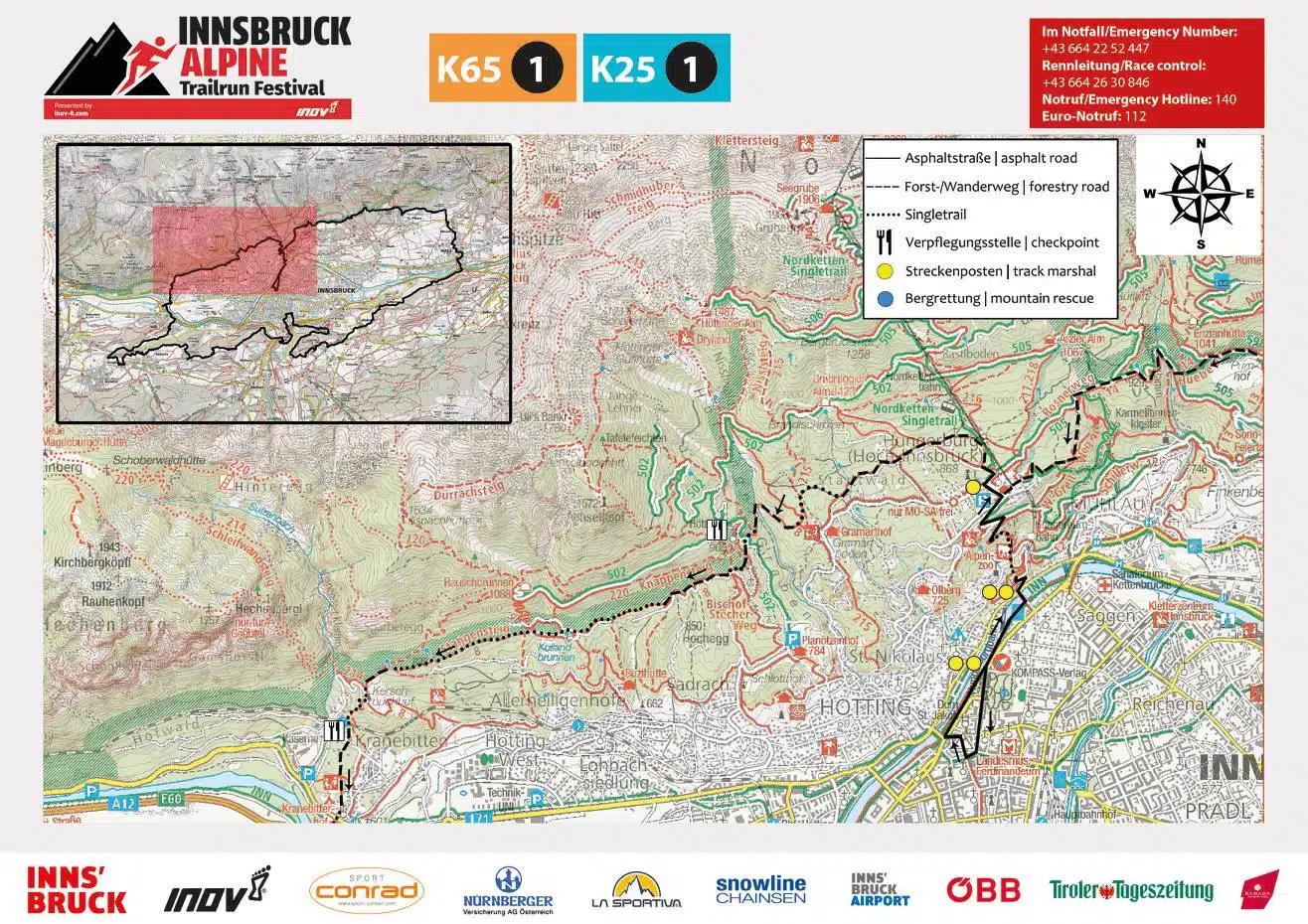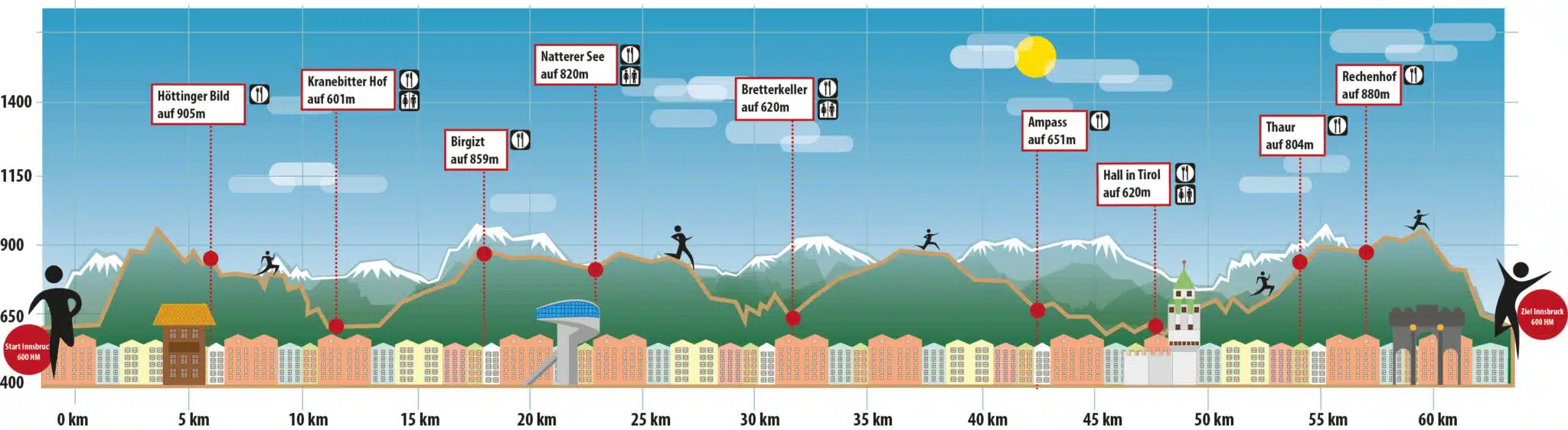 Der Startschuss fällt im Zentrum von Innsbruck, danach geht es hinauf Richtung Hättinger Bild, hinunter zum Kranebitter Hof, weiter nach Birgitz und zum wunderschönen Natterer See. Beim Bretterkeller hat man in etwa die Hälfte des Weges geschafft. Weiter geht es Richtung Ampass und Hall in Tirol, wo die Altstadt durchquert wird. Auf den letzten knapp 18 Kilometern geht es noch einmal steil aufwärts nach Thaur und zum Rechenhof – dann ist es geschafft. Ein feiner Downhill führt zurück in die Stadt und ins Ziel!