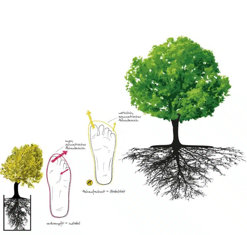 Bei herkömmlichen Schuhen werden die Zehen (insbesondere der große Zeh) gequetscht und können ihre natürliche Funktion, den Fuß zu verankern und zu stabilisieren, nicht erfüllen. Als Ergebnis stehst, gehst und läuft man auf einer instabilen Basis, die nicht nur zu Dysfunktionen und Fehlstellungen führt, sondern auch der häufigste Grund für laufbedingte Schmerzen und Verletzungen ist.