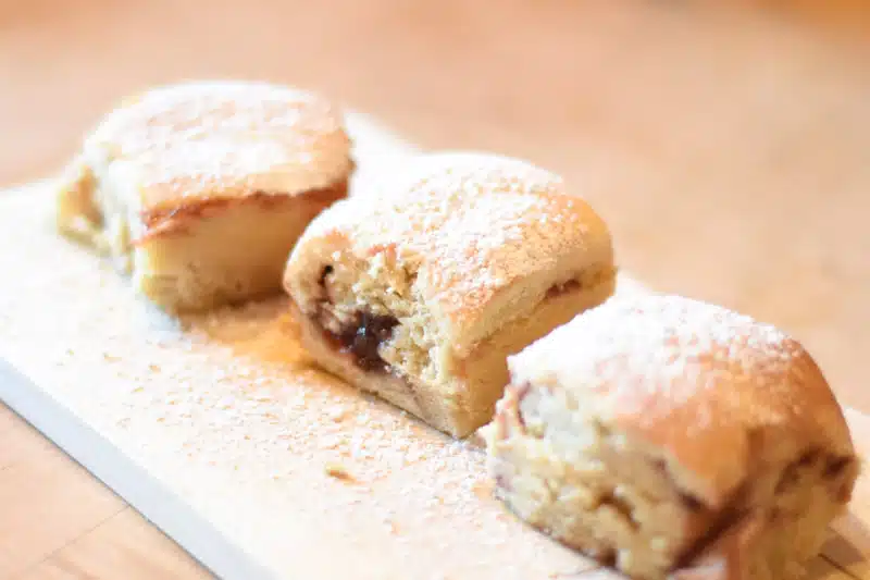 Der Teig wird zugedeckt ca. 30 min. stehengelassen, anschließend in gleich große Teile geteilt. Die ‚Teiglinge‘ ausrollen, diese sollten ca. einen Durchmesser von 10-15 cm haben; einen löffel Marmelade in die Mitte geben und verschließen.