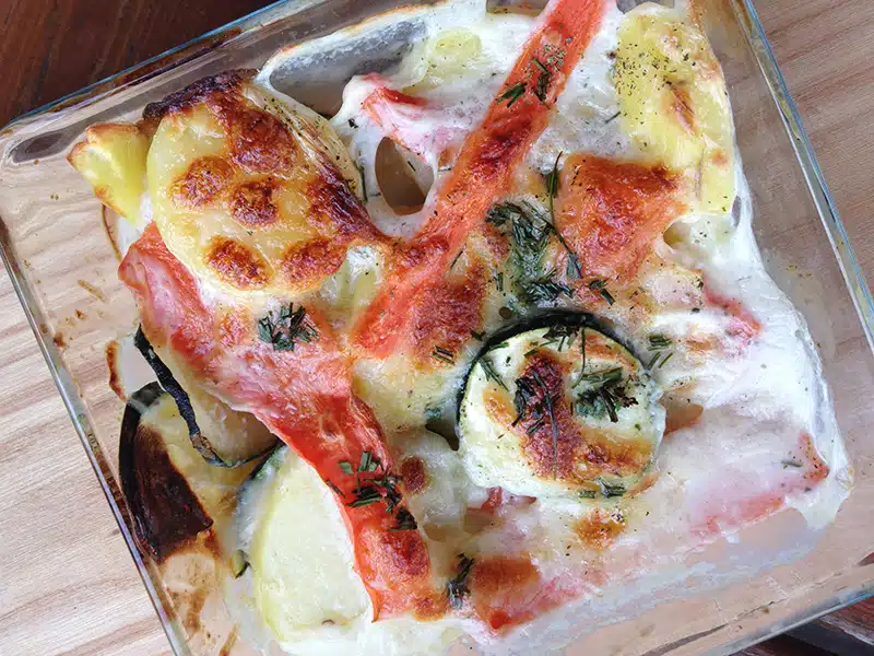 Im Sommer ist so ein Gemüse-Gratin genau das Richtige! V.a. kann man es vor der Trailrunning Tour vorbereiten und beim Heimkommen einfach in den Ofen schieben. währenddas Gratin im Ofen ist, hat man genug Zeit zum Duschen und Dehnen.
