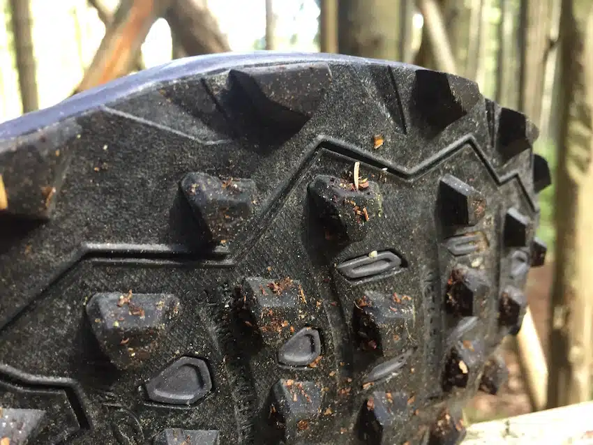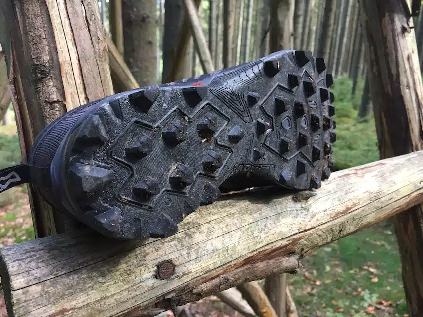 Beim Blick auf die Fotos sieht man es sofort: Die Sohle ist für matschige Bedingungen ausgelegt. Die Stollen sind 8 mm hoch und so ausgerichtet, dass weder Steine noch Matsch hängenbleiben können. Die Gummimischung ist inov-8’s bewährter ‚STICKY GRIP‘, sie hält auf jeden Fall was sie verspricht!