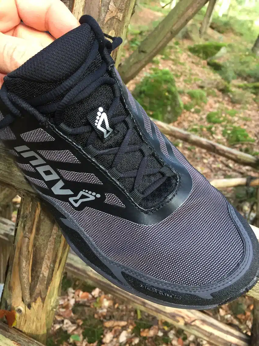 Der Fuß steht im X-Talon 260 Ultra sehr gut und kompakt. Der Fersenhalt ist sehr, sehr gut. Das ist vor allem der Schnürung zu verdanken, die wirklich weit nach oben reicht, wodurch der Fuß sehr gut umschlossen wird. inov-8 bietet für ihre Schuhe eine Skala der Weite der Schuhe, die von 1 bis 5 reicht. Der X-Talon liegt hier bei 4, was sich im Vorfußbereich bzw. der Zehenbox bemerkbar macht, die sehr großzügig ausfällt. Bei Ultras sollte das ein Vorteil sein, denn wenn sich der Fuß ausdehnt, dann ist ausreichend Platz immer gut.