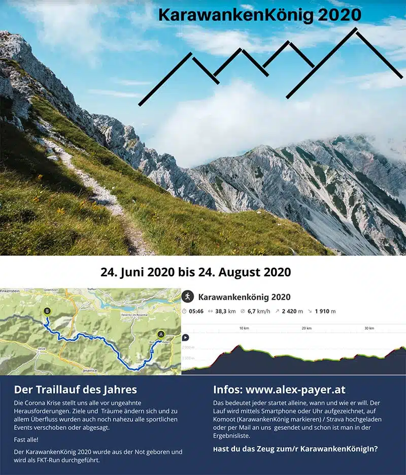 http://www.alex-payer.at/karawankenkoenig2020/ - Der Karawankenkönig ist kein vollorganisierter Wettkampf. Jeder ist selbst für Planung und Durchführung verantwortlich. www.komoot.de stellt unter KarawankenKönig2020 Kartenmaterial zur Verfügung.