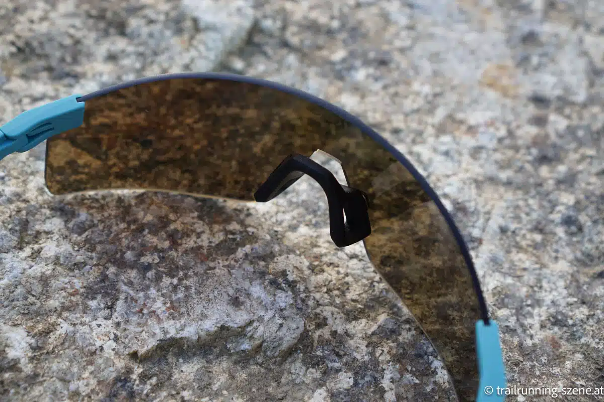 So gut die Optik ist, so schlecht ist auf ruppigen Trails manchmal der Sitz. Ich hätte mir mehr Halt gewünscht, denn bei schnellen Bewegungen, schnellen Downhills mit Sprüngen musste ich immer wieder zur Brille greifen, um diese zurecht zu rücken. Das sollte eigentlich nicht passieren. Auch am Kopf kann ich sie nicht positionieren, wenn es mir mit der Brille zu dunkel wird, denn sie hält nicht. Gegensteuern kann man hier mit einer Kappe, wenn man die Bügel etwas darunter steckt.