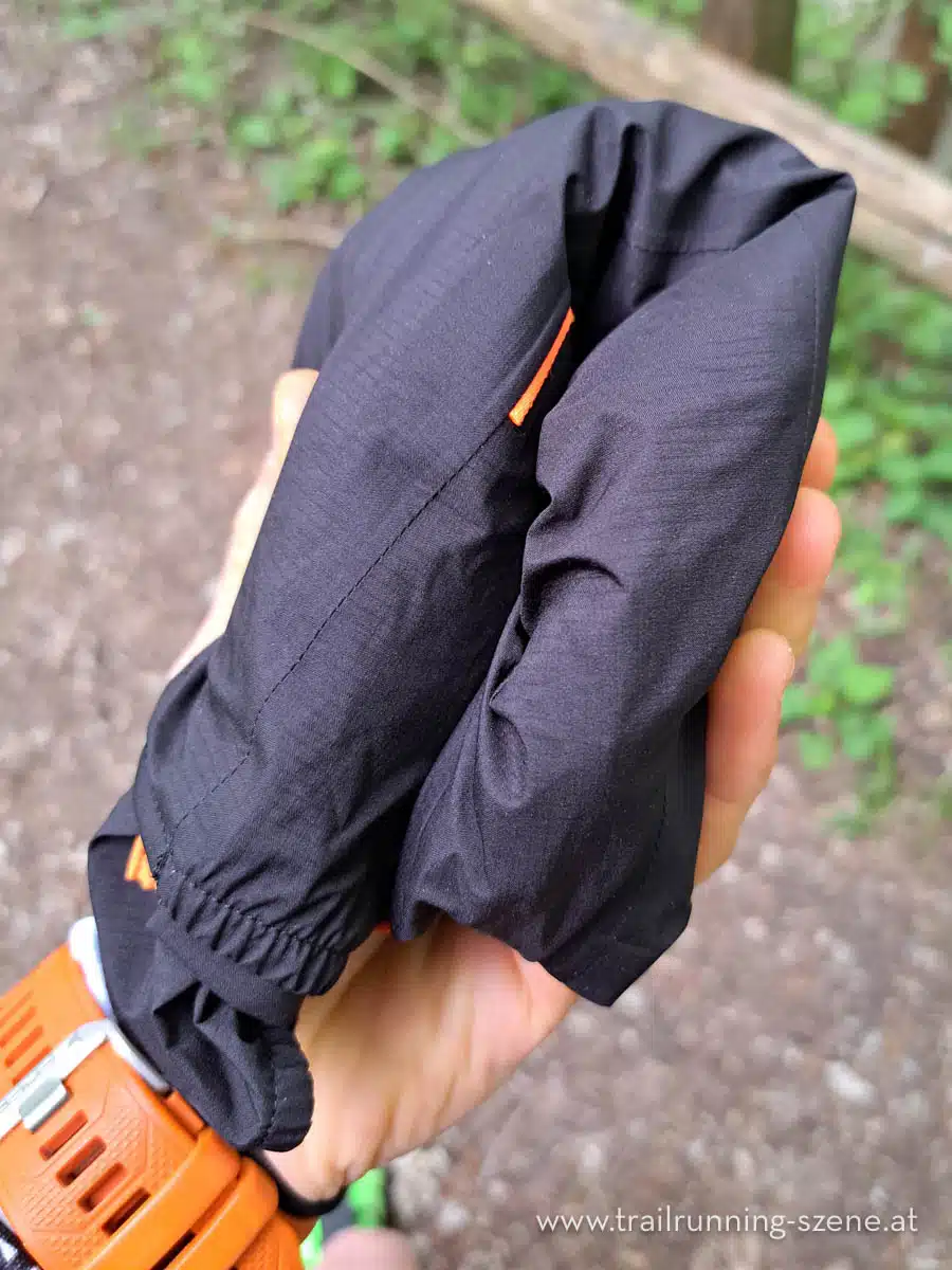 Das Packmaß ist extrem gering – perfekt für Touren mit kleinem Gepäck oder eben weil man in den Bergen ohnehin ausnahmslos eine Hardshell Jacke dabei haben sollte.