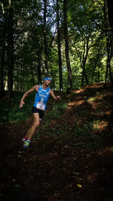 Mit Start/Ziel im Freibad Fürstenfeld ging es für die Starter durch den Campingplatz, um danach in den Sagenpfad einzubiegen – mit Forstwegen, Wurzeln, Gräben und tollen Singletrails wurde es den Läufern nicht langweilig. Eine Besonderheit, die ich so von anderen Läufen nicht kenne, waren die Einzelstarts im Intervall von 20 Sekunden mit persönlichem Startkommando vom Veranstalter Wolfgang. Dadurch konnte man zwar seine Vorderfrau/seinen Vordermann auf dem ersten Kilometer optisch folgen; ab dem Buchwald war ein „einfach nachlaufen“ aufgrund der Geländegegebenheiten nicht mehr möglich. Da hieß es dann Fährte lesen: mit Fähnchen, Bändern oder teilweise auch nur mit Ästen war der Weg, der querfeldein führte, markiert. Das machte den Lauf gleich nochmals spannender, da nicht nur läuferische, sondern auch koordinative und kognitive Fähigkeiten gefordert waren. Aufgrund des starken Regens am Vorabend konnten auch die Trailschuhe zeigen, was sie konnten. Der eine oder andere Läufer, der mit Straßenlaufschuhen unterwegs waren, küsste schon mal den Boden.