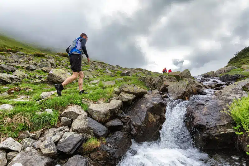 Nach 4km wieder beim Start vorbei, dann bergauf in Richtung Silbertaler Winterjächle. Ich konzentriere mich auf die 18km und 1000 Höhenmeter, die ich in den nächsten etwa 2 Stunden überwinden sollte. Es geht erst wenig, dann richtig steil, dann fast eben, und wieder steil auf einer Forststraße zur Oberen Fresch Alpe. Von dort auf einem sehr feuchten Bergpfad über das Winterjächle auf 1945 Höhenmeter. Es hatte in der Früh geregnet, kurz vor dem Start wurde es dann trocken. Oben, am Winterjächle fing es wieder an ein wenig zu regnen. Es war ein sehr kalter Regen, fast schon Schneefall. Die 2km auf diesem Bergpfad waren die Hälle: Matsch, feuchte Steine und Wurzeln, viele Walker um die man herum musste, ein paar Schritte gehen, dann wieder laufen, dann wieder vorsichtig über kleine Bäche hüpfen – fast stolpern.