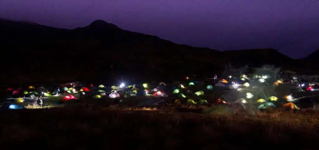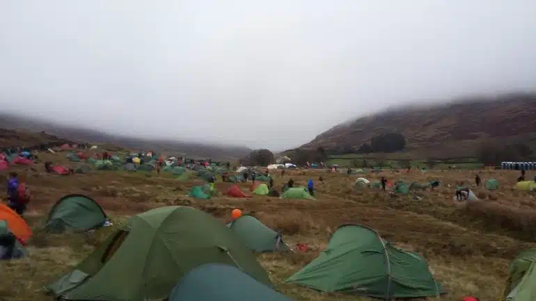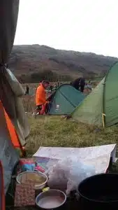 Dann machen wir etwas, das unsere Mitstreiter etwas verwundert. Aus unseren Rucksäcken holen wir Essen, und nochmal Essen, und dann noch mehr Essen. Da hatten wir es wirklich ein bisschen zu gut gemeint, aber bei einem Event wie dem Original Mountain Marathon ist es ein großer Motivationsschub, sich etwas zu gönnen. Finden wir zumindest! Und so ziehen wir mit einem Kirschschnaps und Süßigkeiten von Zelt zu Zelt und plaudern mit den Nachbarn. Eine tolle Stimmung ist das hier! Trotz der Anstrengungen, die hinter allen Menschen hier liegen, plaudert jeder gerne. Man erzählt zahlreiche Anekdoten von der Strecke und lernt sich ein wenig kennen.