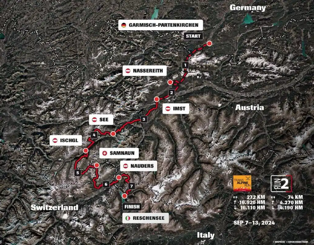 Am 7. September 2024 startet der 19. DYNAFIT Transalpine Run powered by Garmin (TAR) auf seine siebentägige Reise über die Alpen, von Garmisch-Partenkirchen am Fuße der Zugspitze durch Österreich und die Schweiz bis an den Reschensee in Südtirol. Mit 900 Athletinnen und Athleten aus 34 Ländern verbucht die legendäre Alpenüberquerung ein neues Rekord-Starterfeld. Insgesamt sind 272 Kilometer und 16920 Höhenmeter zu bewältigen.