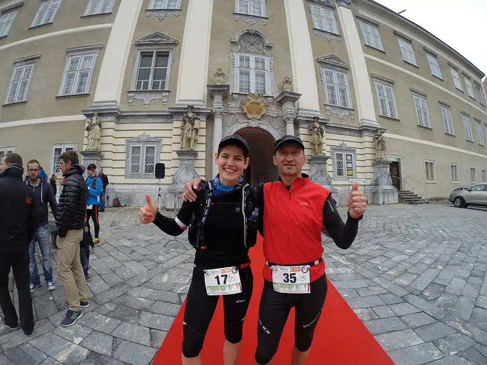 Mir geht es jetzt wieder richtig gut, die Energie kehrt zurück (auch wenn ich im Wald in jeder Wurzel und jedem Ast ein Tier sehe und Heli Musik härt…) Das letzte Stück laufen wir wieder, das Stift St. Lambrecht ist schon in Sicht. Das Finish hier kann uns niemand mehr nehmen, ein Wahnsinn! Wir haben es wirklich geschafft, 167 Kilometer und über 7000 Höhenmeter, mit dem vielen Verlaufen vermutlich mehr als 180 Kilometer.