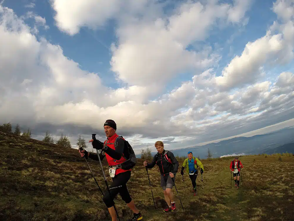 Pünktlich um 18:00 Uhr fällt der Startschuss, es geht los, hinaus aus Sankt Lambrecht, weiter zum Auerlingsee und hinauf aufs Scharfe Eck. Der erste Anstieg ist bereits extrem steil, aber zu Beginn sind wir noch energiegeladen und erreichen gut und schnell den ersten Wasserkanister bei der Dreiwiesenhütte. Es geht weiter aufwärts, aufwärts, als ich zur Sicherheit das GPS auf meiner Uhr kontrolliere und schreie: „Heli, Stopp, da passt was nicht!“ So ein Sch – komplett falsch, wir laufen alles wieder retour hinunter und versuchen den richtigen Weg zu finden. Aber gut, einmal verlaufen kann passieren.