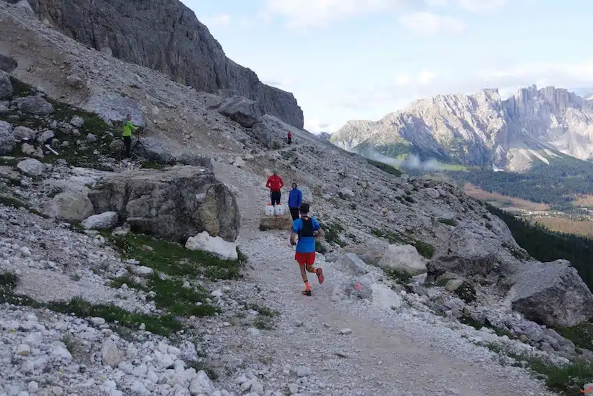 Ich befinde mich ungefähr bei km 35 des Rosengarten-Schlern Skymarathon, der nach meiner ersten Teilnahme 2018 für mich sofort ein Fixtermin geworden ist: der Lauf kombiniert so ziemlich alles was Trailrunning zu einem so genialen Sport macht: die atemberaubende Dolomitenlandschaft, gnadenlose Anstiege, super technische Downhills und dazu italienisches Klima, Lebensart und natürlich das geniale Essen! Während ich über den herausfordernden Trail Richtung Tal renne, tagträume ich von arktisch kaltem Eistee… Die Hitze ist nicht so sengend wie im Jahr davor, vor allem in den höheren Lagen ist sie gut erträglich, aber beim hochkonzentrierten Ritt in Richtung Tal spürt man wie es mit jedem negativen Höhenmeter wärmer wird, die heiße Luft schlägt einem förmlich ins Gesicht. Hinter mir liegen bereits ziemlich alle Aufstiegsmeter und auch die panoramamäßig imposantesten Passagen im Bereich des Grasleiten- und Molignonpasses. Auch wenn sich an vielen Stellen ein Déjà-vu einstellt, bleibt die Faszination für diese schroffen Felsformationen ungebrochen. Obwohl ich mir dieses Mal eigentlich vorgenommen habe keine Fotos zu machen, weil ich ja schon da war, kann ich der Versuchung dieser wunderschönen Aus- und Einblicke nicht verwehren und banne sie immer wieder auf digitalen Film.