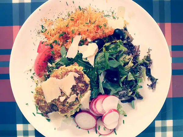 Der Salat kann je nach Geschmack variieren, wir haben hier grünen Salat aus dem Garten, Karotten, Radieschen, Oliven und Tomaten.