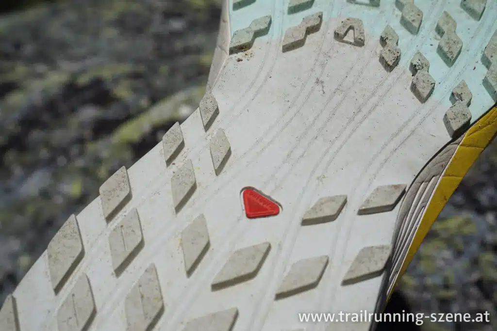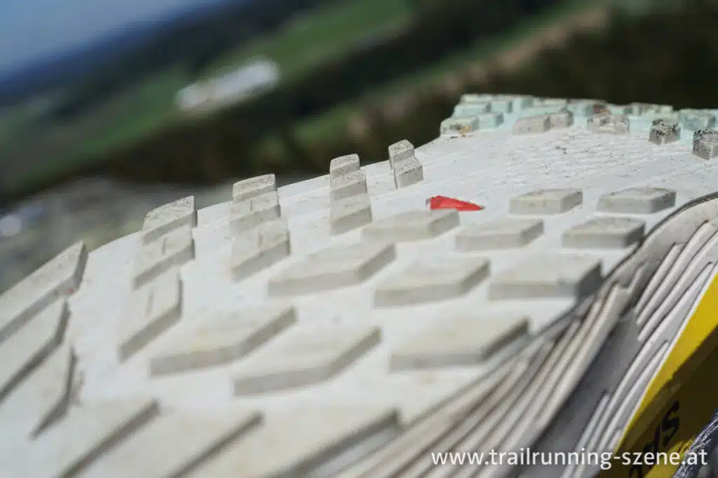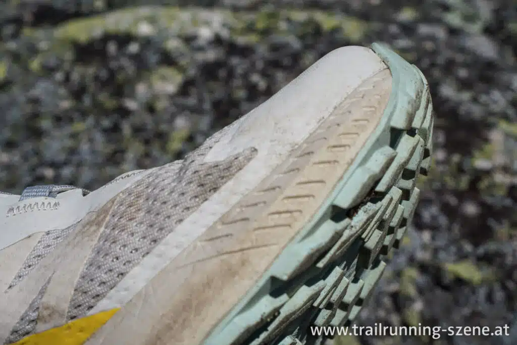 Die Contagrip Sohle von Salomon wurde und wird stetig weiterentwickelt. Das merkt man beim Sense Ride 5, denn sie hält, auch wenn es am Fels ein wenig rutschig wird, sehr zuverlässig. Die Stollentiefe beträgt 3,5 mm – das ist ein guter Mittelwert. Wenn es sehr matschig wird, ist man mit einem Speedcross o.ä. besser beraten, aber hier geht es um einen Allround Einsatz und in dem Fall passt die Tiefe genau. Steine und dergleichen können definitiv nicht hängen bleiben.