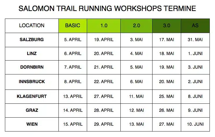 Wer bereits jetzt begeisterter Trail Runner ist und seine Technik verbessern will oder einfach einmal starten möchte, der kommt zu den – How to Trail Runa – Workshops von Salomon. In nur 5 Laufeinheiten vermitteln die anwesenden Experten alles, was man für ein Laufabenteuer in der Natur braucht. Unterdessen kann man auch jede Menge Salomon-Produkte testen, um das passende Material gleich im Prozess zu finden. für ein unvergleichliches Lauferlebnis.