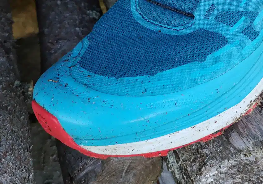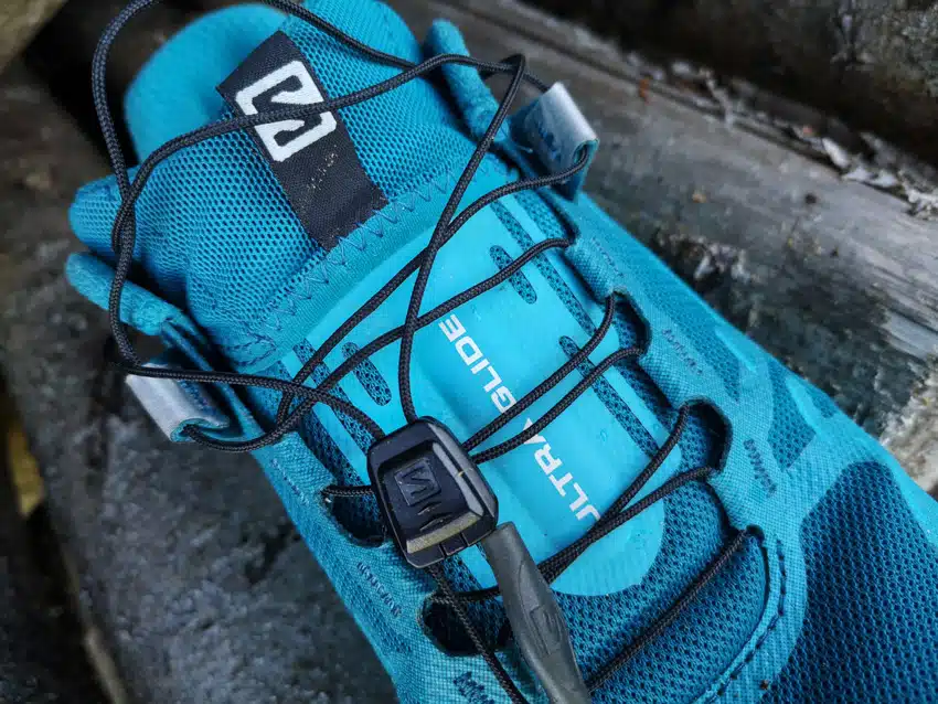 Das Obermaterial besteht aus Mesh und ist sehr atmungsaktiv. Wir haben den Schuh auch bei Temperaturen über 25 °C getestet, das ist überhaupt kein Problem und der Fuß überhitzt nicht. Rundherum sind sozusagen Schutzzonen integriert, die den Schuh vor allem im felsigen Gelände davor schützen, irgendwo aufzureißen (siehe Fotos). Bei der Schnürung setzt man auf Quicklace – ein einziger starker Zug, den man schnell auf- und zumachen kann.