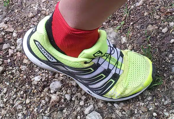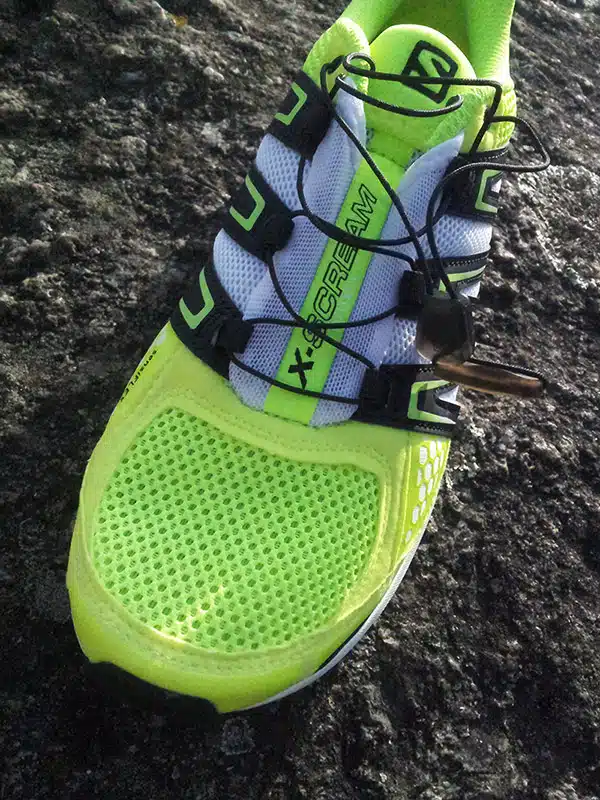 Salomon arbeitet mit dem ‚Quicklace‘ System, das funktioniert gut; das Band lässt sich perfekt in der kleinen Schnürsenkeltasche verstauen.