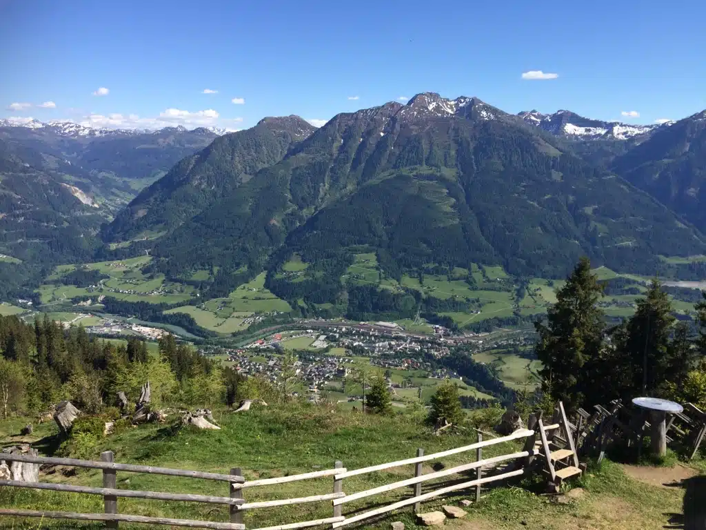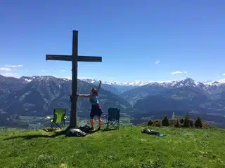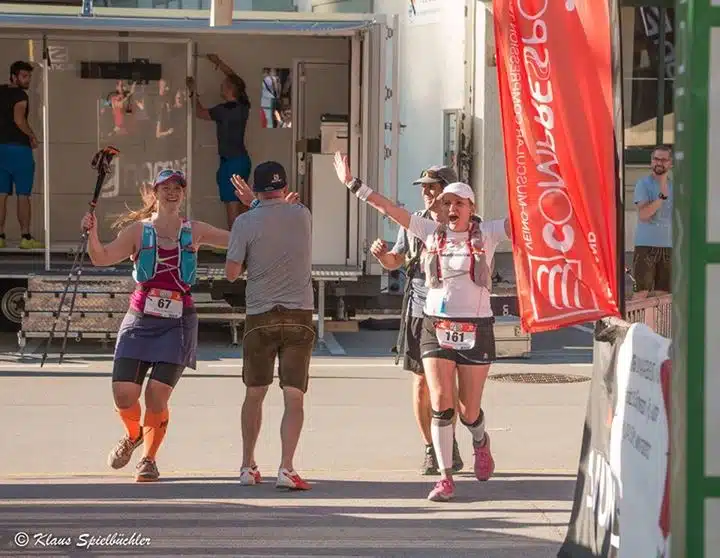 Nach dem Schneeberg ging es steil bergab über einen sehr wurzeligen Weg bis zum Althaus. Die Oberschenkel brannten inzwischen gewaltig und mir tat das Hinunterlaufen sehr weh. Sorge kam kurz auf, dass wir vielleicht doch die Cut Off Zeit nicht erreichen könnten. Szilvia war von dem Down-Hill den wir uns leichter vorgestellt hatten auch nicht ganz so begeistert. Mit ihrem süßen ungarischen Akzent, schimpfte sie: „Da kann ich nicht laufen. Das ärgert mich.“ Definitiv war das für uns der schwierigste Teil des Trails. Wir erreichten mit letzten Kräften die Labestelle nur 10 Minuten vor Vier und durften im Rennen bleiben. Vor Freude machte ich einen Riesensprung den Klaus Spielbüchler, der phänomenale Eventfotograf, mit seiner Kamera festhielt. Frisch gestärkt rasten wir den weiteren Downhill hinunter und nahmen den letzten steilen Anstieg zum Hochglocker in Kauf, ca. 500 Höhenmeter. Von der Labstelle Weg begleitete uns zusätzlich noch Peter, der Schlussmountainbiker. Mah, das war aber mega nett. Es war schon wie eine richtige persönliche Eskorte. Vor Allem konnten wir neben dem stetigen Bergaufschritt immer wieder gemütlich plaudern, was von den Strapazen der eigentlichen Anstrengung des doch bereits langen zurückgelegten Weges ablenkte. Komisch, wir waren seit beinahe 8 Stunden unterwegs und ich hatte bis dato kein einziges Tief. Bester Laune gelangten wir zum letzten Gipfelkreuz und wurden abermals mit einer traumhaft schönen Aussicht belohnt!