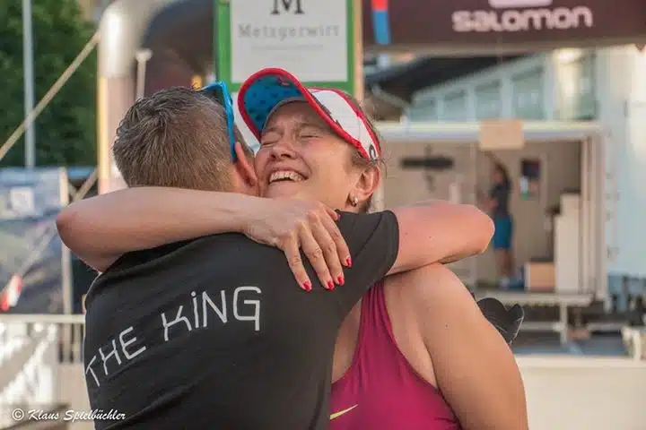 Mehr brauchte es nicht und mir liefen Glückstränen über die Wangen. Was für ein Moment, welch ein Triumph! Da sind wir, wir haben es tatsächlich geschafft! Ganz Schwarzach und Fredl warten schon, der strahlende Veranstalter klatscht einen jeden von uns ab und wir bleiben unter dem Zielbogen stehen! Bekommen die schönen Holzmedaillen umgehängt, Schwarzach Trail Finisher 2017, was für ein grandioser Empfang! Wir fühlen uns als hätten wir das Rennen gewonnen!
