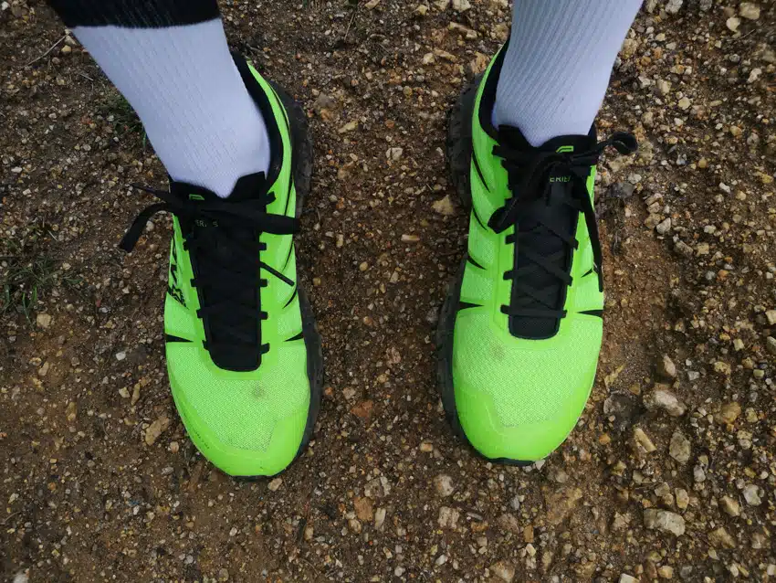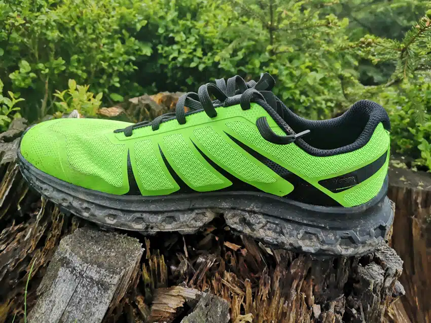 Beim ersten Blick auf den Schuh könnte man meinen, er ist ein wenig ‚patschert‘, wie man in Österreich gerne sagt. Das ist zum Glück gar nicht so. Trotz seiner eher schweren 300 g fühlt sich der Schuh vom ersten Moment sehr dynamisch an. Das Gefühl für den Untergrund ist gut, der Fuß steht sehr kompakt im Schuh, der Fersenhalt ist top. Die Zehenbox ist großzügig breit geschnitten. So kann sich der Fuß ausdehnen, wenn man sehr lange unterwegs ist.
