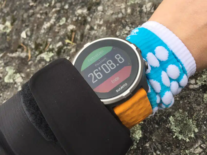 Suunto empfiehlt, bei der HF-Messung am Handgelenk die Uhr Höher als gewähnlich zu tragen. Im Test fällt diese Messung sehr ‚wackelig‘ aus. Wird die Uhr ganz normal getragen, funktioniert die Messung – auch wenn die Uhr richtig fest am Handgelenk sitzt – bei Sportarten, bei denen man stark in Bewegung ist, nicht zuverlässig. Die Uhr zeigt oft konstant einen Puls von 190 und mehr an. Besser klappt das zum Beispiel am Rad.