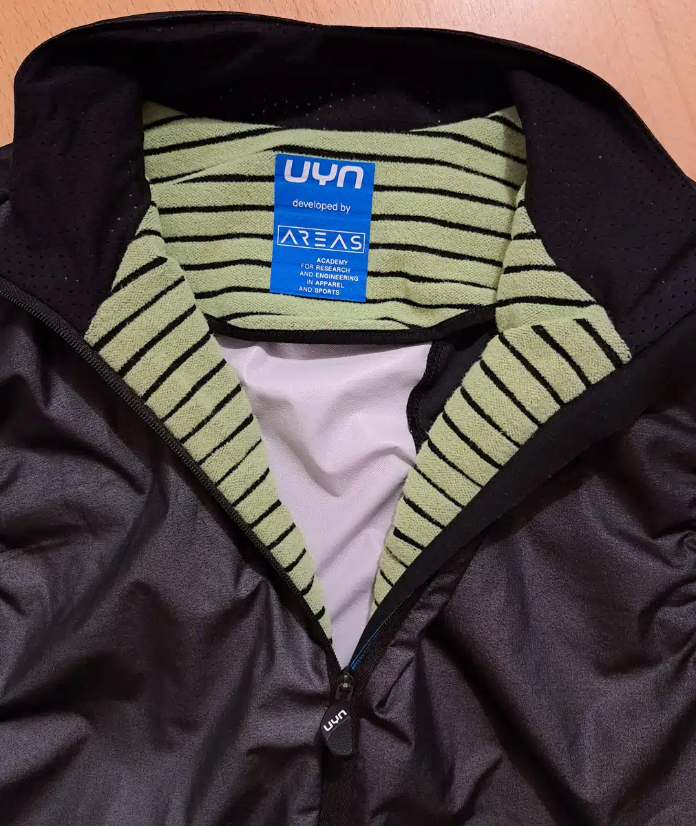 Der Kragen ist hoch geschnitten und innen mit einem weichen Futter versehen. Das Innenfutter und Material ist eine bodymapped Buffercone Techologie. „Es hält die Körperwärme in kühlungsgefährdeten Bereichen zurück und schafft ein isolierendes Polster, gleichzeitig ermöglicht die dreidimensionale Struktur des Gewebes eine große Belüftung.“
