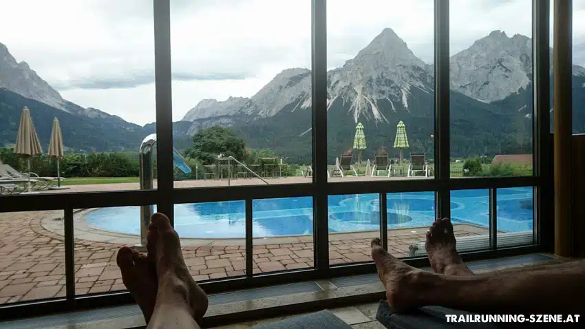 haben wir es uns im Hotel Post, direkt in Lermoos, gemütlich gemacht. Im Hallenbad kann man die müden Muskeln auslockern, auf der Liege genießt man den Ausblick Richtung Zugspitze und Wettersteingebirge – traumhaft! Ein bisschen Luxus darf auch bei einem Abenteuer sein, oder? 😉
