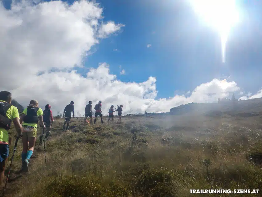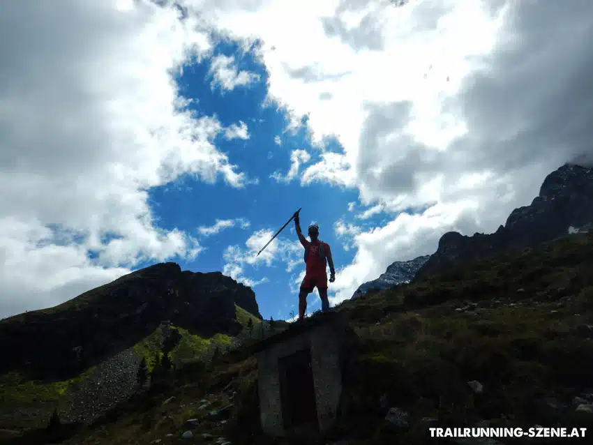 Von Imst geht es erst einmal hinaus Richtung Arzl, hinein in einen Steig – der übliche anfängliche Bergauf-Stau ist relativ schnell vorbei und wir kommen gut voran. Bergauf, bergab, anfangs recht unspektakulär. Das ändert sich aber spätestens ab Kilometer 20, Richtung Tiefentaler Alm. Die Wege werden technischer und immer schöner, die Sonne kommt heraus, wir sind in einem richtigen Runner – s High (oder soll man sagen äsWalker – s High – denn laufen ist aufgrund der Wegbeschaffenheit nicht immer möglich).
