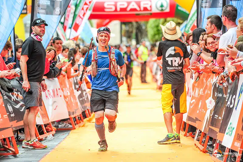 Mein Lieblingsabschnitt liegt hinter mir, ich stärke mich kurz, gehe durch einen Tunnel mit kühlendem Wassersprühregen und mache mich daran den letzten Anstieg in Angriff zu nehmen. Ab jetzt tut alles weh, durch ein ausgetrocknetes Flussbett geht es zuerst noch relativ zügig, dann tut sich eine Wand vor mir auf: es geht steil durch Bananenplantagen nach oben. Die Mitstreiter die ich hier treffe sind alle am Ende ihrer Kräfte, wir versuchen uns mit Scherzen und Lachen von den Strapazen abzulenken. Im Schneckentempo schieben wir uns mit Stöcken oder mit den Handflächen auf den Oberschenkeln abstützend den harten Weg nach oben. Anfeuerungsrufe von Passanten verhallen im Nirvana, jetzt wollen wir nur noch die Ziellinie überqueren. Nach schier endlosen Bananenpalmenhainen endlich die Straße mit dem blauen Fahrradstreifen: das ist das Signal für den Schlusssprint. All meine letzten Kräfte mobilisierend setze ich zu einem Laufschritt an, von jetzt an wird die Zuschauerdichte wieder Höher, kleine Kinder halten ihre Hände erwartungsvoll zum Abklatschen hin, wie könnte ich diese Freundlichkeit nicht erwidern. Schmerzen und Erschäpfung treten in den Hintergrund, jetzt heißt es so viele Kinder wie möglich abzuklatschen und die Zähne zusammenzubeißen. Nach der Rechtskurve werden Applaus und Anfeuerungsrufe noch lauter, mein iPod ist schon lange ausgeschaltet, ich will diese Stimmung mit allen Sinnen aufsaugen. Jetzt biegt der Kurs ein allerletztes Mal um eine Kurve, der finale Zielsprint vorbei an unzähligen enthusiastischen Zuschauern und dem Sprung über die Ziellinie werden für immer unvergessen bleiben. Transvulcania, was für eine Atmosphäre, was für ein Traum von einem Lauf!