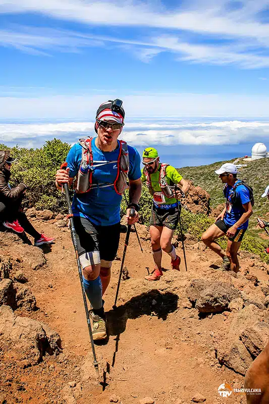 Die nächsten 25-26 Kilometer gehen recht gut dahin, doch knackige Anstiege scheinen sich langsam wieder zu häufen und es wird klar, dass nun die restlichen aufwärts gerichteten Höhenmeter fällig sind, denn der Roque de los Muchachos wartet schon. Da der Roque sowohl höchster Punkt, als auch Cut-off Checkpoint und der – Start des eigentlichen Rennensa – ist, sehnen sich alle Läufer danach, endlich dort oben zu stehen. Ab der Marathongrenze ziehen sich die letzten paar Kilometer dahin aber unglaublich. Wie ein achtlos weggeworfener Kaugummi in den man unglücklicherweise getreten ist, zieht und zieht sich das letzte Stück hinauf. Auch erwähnenswert: die Sonne hat in den vergangenen Stunden ordentlich an Kraft zugelegt und brennt auf die schattenlose Strecke. Dass La Palma recht windig ist und wir immer mehr oder weniger Grat laufen kommt uns da sehr entgegen. Es ist schon ziemlich warm, aber noch erträglich.