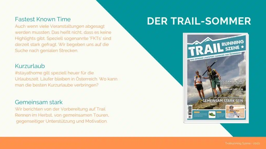 Kein Trailrunning Magazin in Österreich? Warum? Diese Frage stellte sich 2014. Seitdem sind fast 30 Ausgaben entstanden. Die Situation um Corona stellt auch uns vor keine leichte Aufgabe, aber wir sind es unseren Lesern schuldig: Die nächste Ausgabe erscheint fix. Denn Trailrunning verbindet. Trailrunning schafft genau jetzt die Freude, die wir alle so dringend brauchen. Die Sommer-Ausgabe 2020 soll eine ganz Besondere werden.