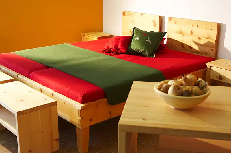 Das Massivholz wird unter BeruI?cksichtigung seines natuI?rlichen Magnetismus entsprechend in die Bettenkonstruktion verarbeitet. Die Verwendung von Zirbenholz, einem regionaltypischen Charakterbaum der Region, zeugt von der Verbundenheit des Tischlermeisters mit seiner Region, kann auf Kundenwunsch aber auch durch andere Holzarten ersetzt werden.